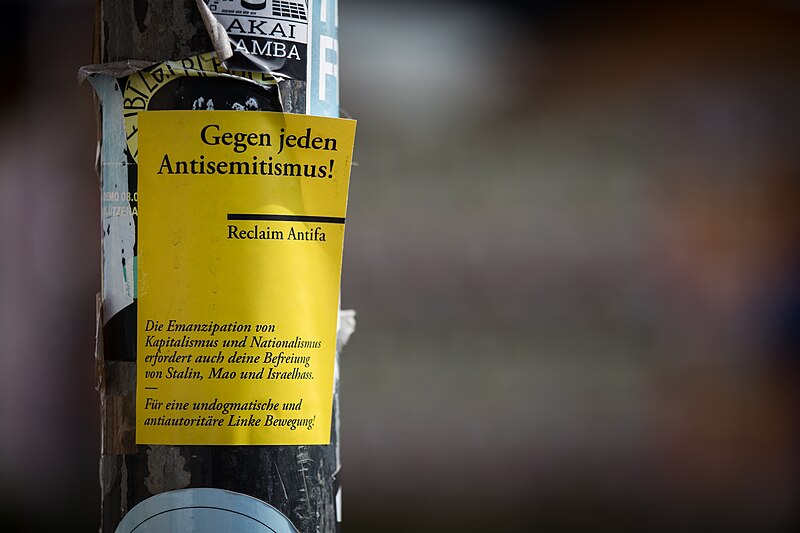 von Elke Wetzig, „Gegen jeden Antisemitismus! Reclaim Antifa, Köln-Ehrenfeld“ https://commons.m.wikimedia.org/wiki/File:Gegen_jeden_Antisemitismus!_Reclaim_Antifa,_K%C3%B6ln-Ehrenfeld_-_8402.jpg